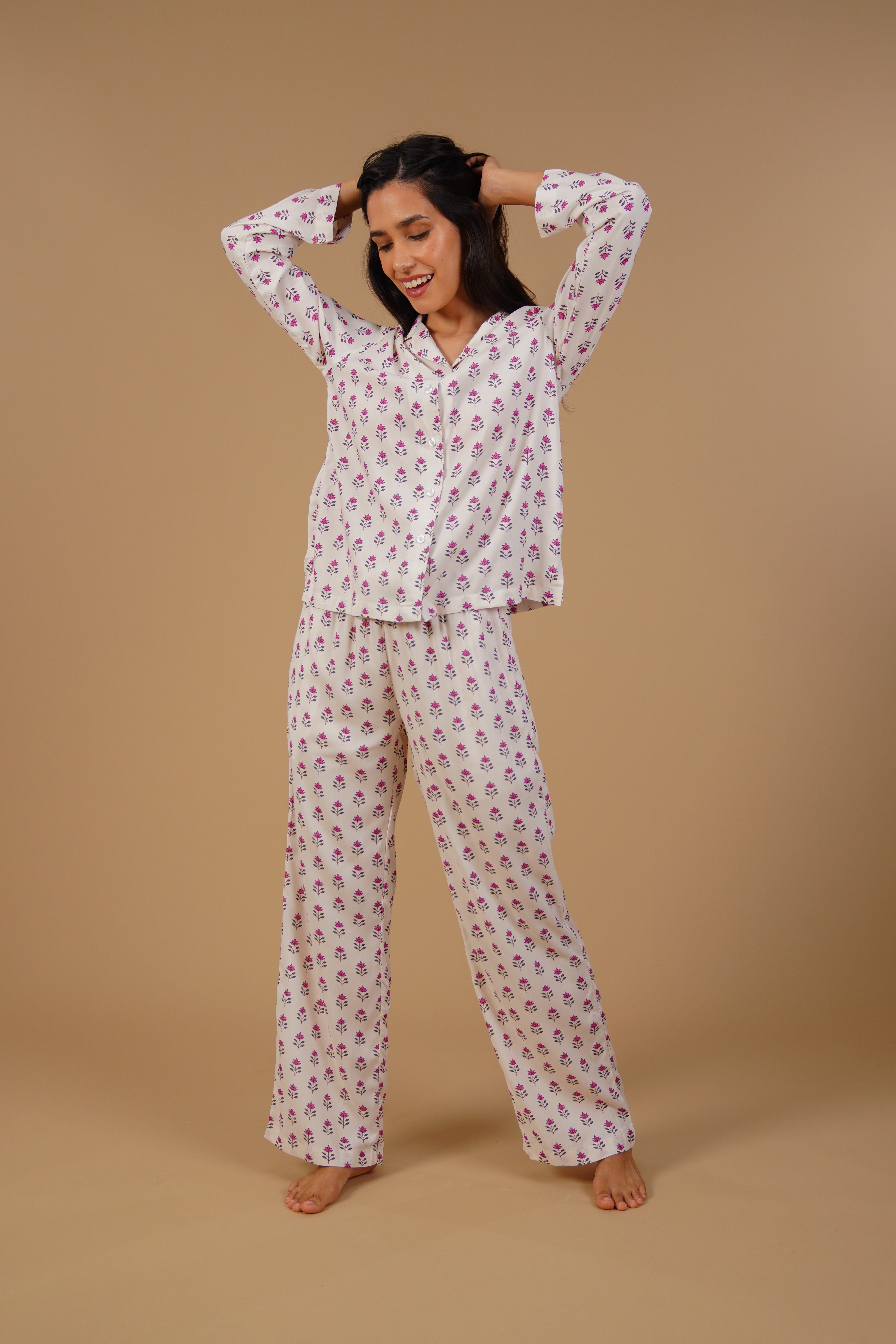 Aira White Floral Printed Viscose Women's Pajama Set - Full Sleeves