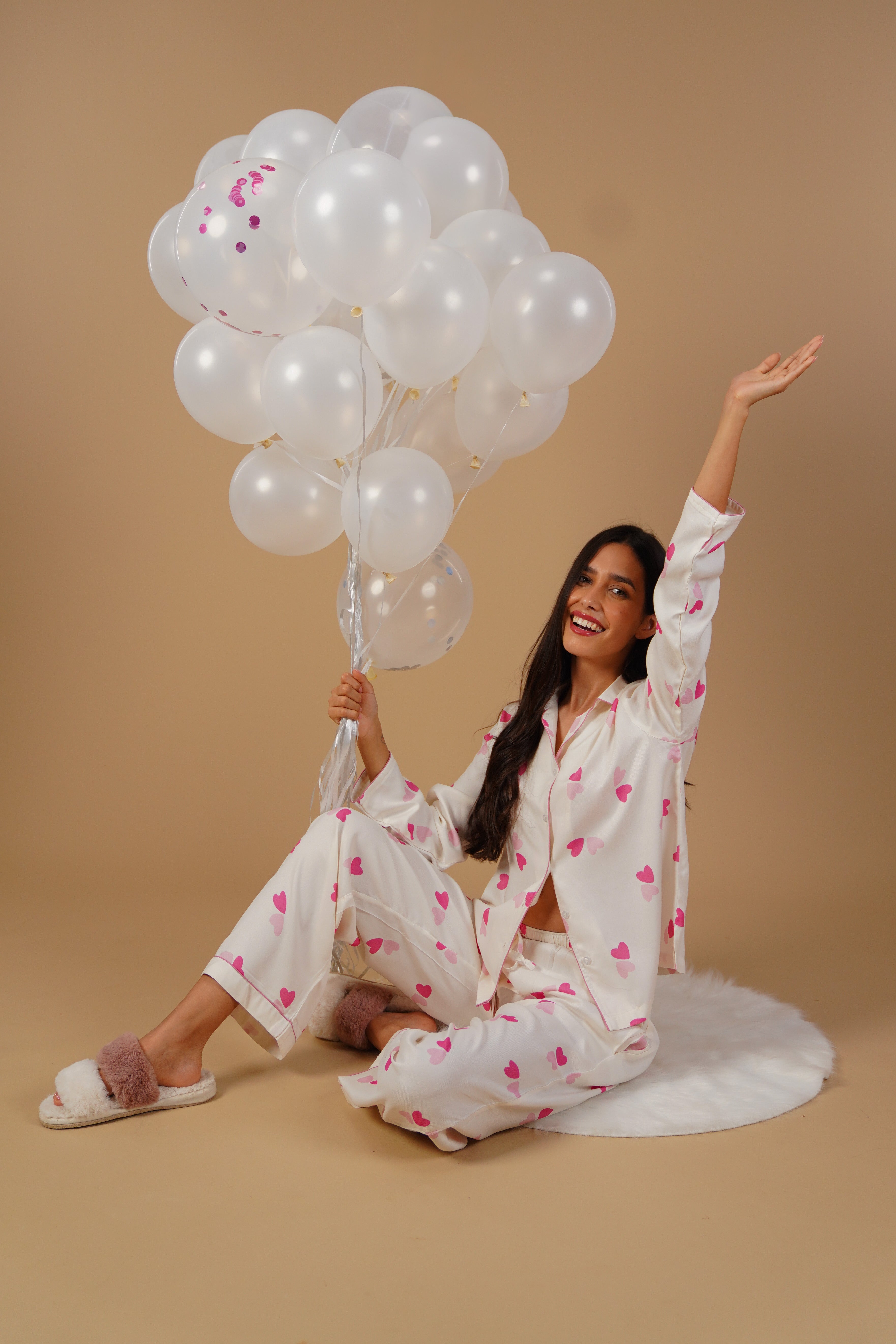 Find cozy charm in the Amy Heart Pajama Set, crafted in a silky-soft, breathable fabric that feels gentle and lightweight on the skin. The playful heart print adds a sweet touch, while the full-sleeve button-down shirt and relaxed-fit pajama bottoms keep the look effortlessly put together.