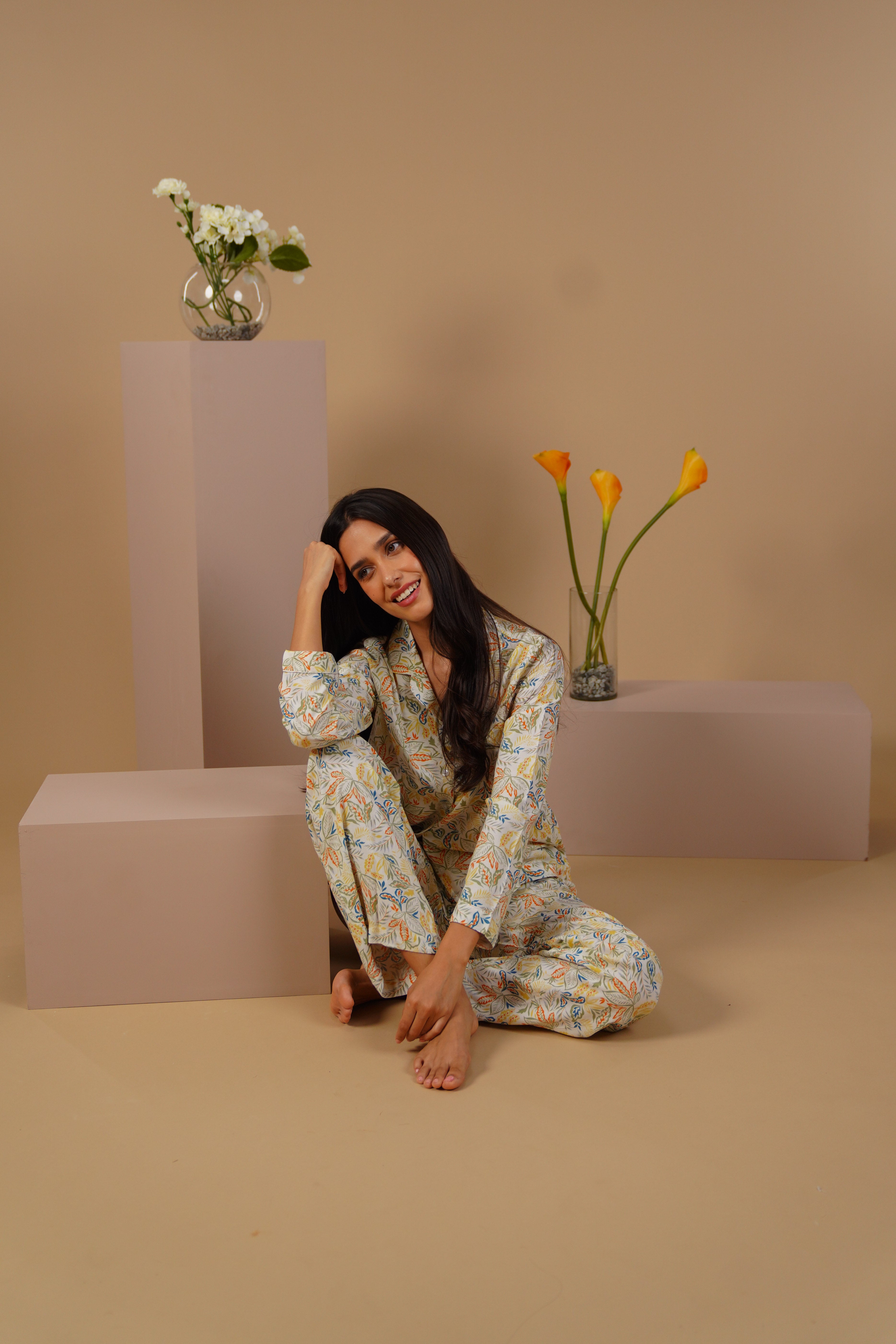 Soft, flowy and made for slow moments, the Autumn Garden Pajama Set is your cozy escape at the end of the day. Crafted from a lightweight cotton blend, it features a delicate floral print in soft autumn tones that bring warmth and charm to your lounge time.