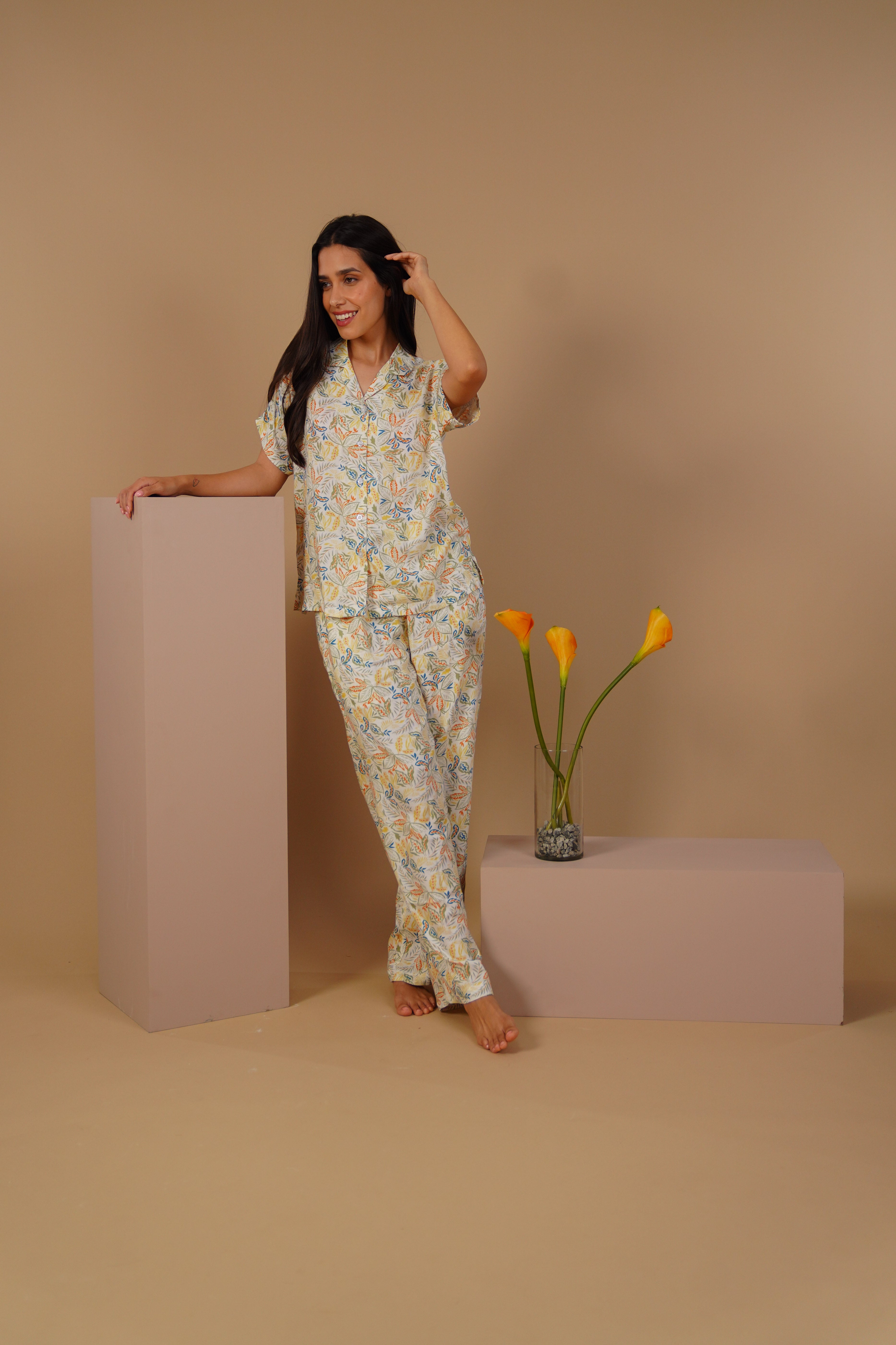 Autumn Garden Printed Cotton Blend Women's Pajama Set- Half Sleeves