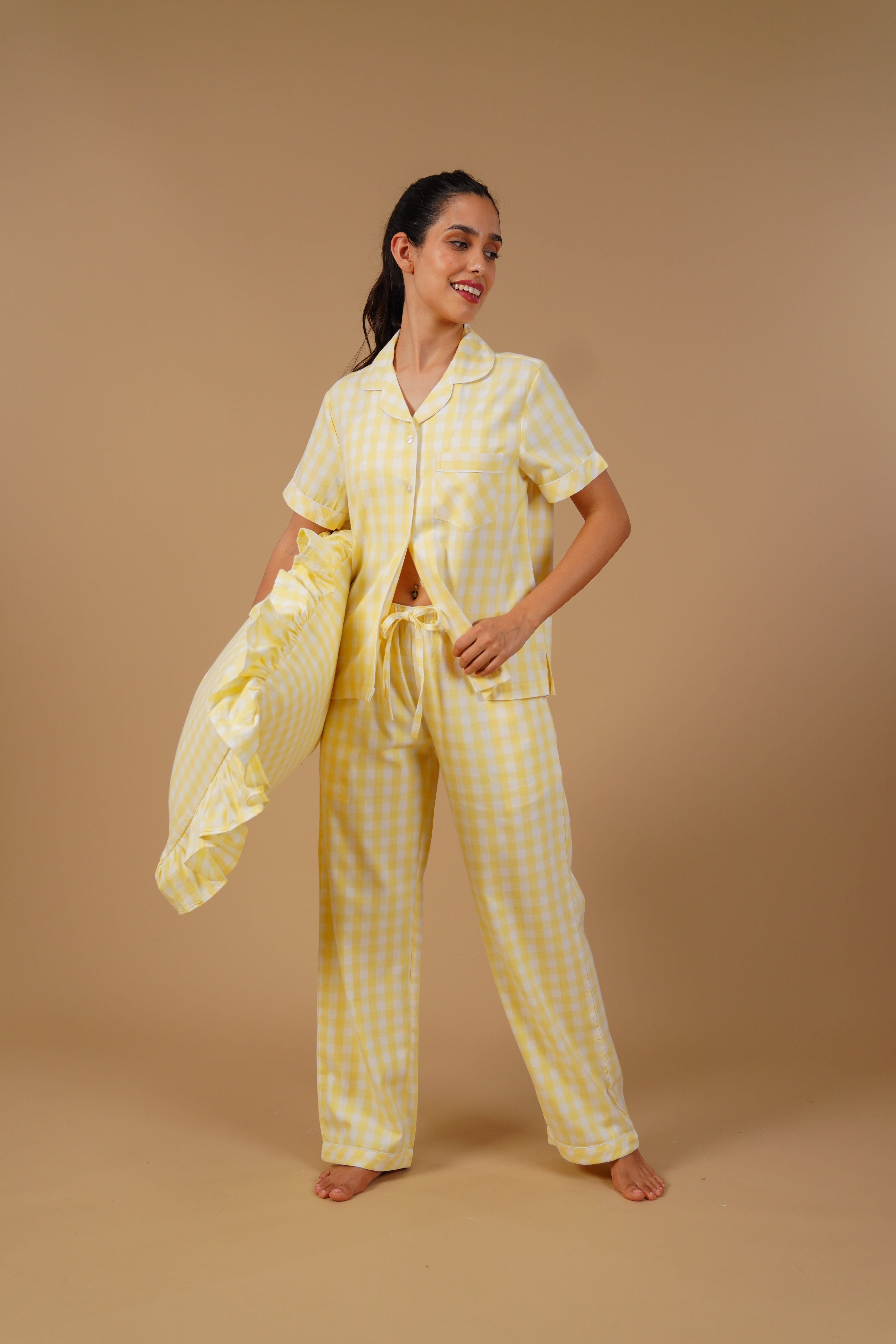 Butter Yellow Checks Cotton Twill Women's Pajama Set - Half Sleeves