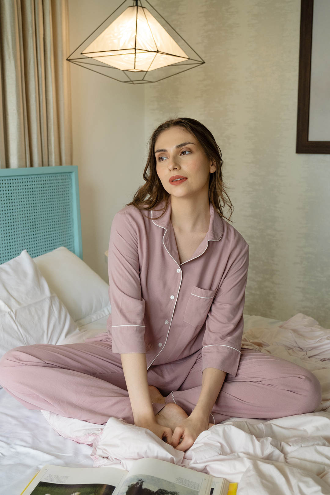 One of our classic styles, Mauve Emily Pajama set is perfect for your girls night in. Buttery soft hand feel, contrast piping on the pajama and shirt and white pearl-like buttons making it a 'must-have' piece in your wardrobe. Prepare to experience nights filled with blissful relaxation, enhanced by the beauty and elegance of our Classic Emily sets.
