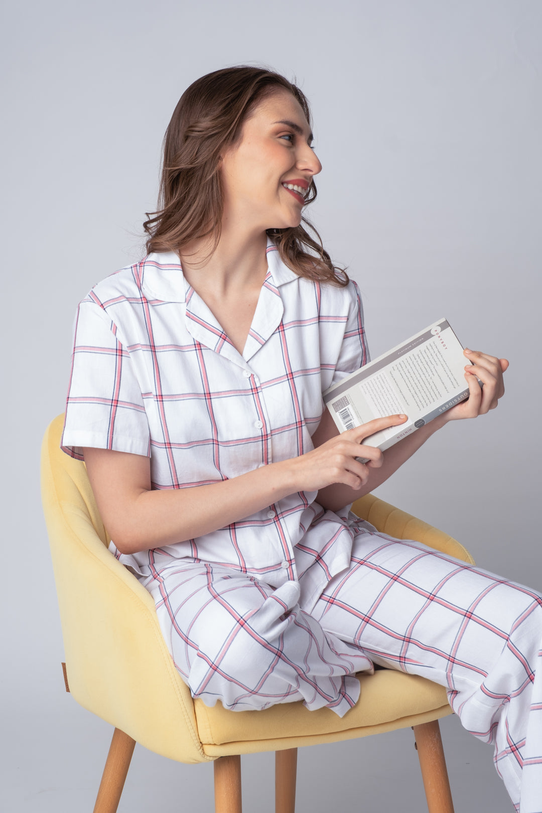 Crafted from soft, breathable cotton, this set features a contemporary wide check pattern that adds a modern touch to your sleepwear collection. Designed for both relaxation and style, the Madeline pajama set has a relaxed collar and elegant pearl white buttons. The comfortable elasticated waistband, complete with a tie, ensures a customized fit, making it ideal for lounging at home or enjoying a weekend away with friends.