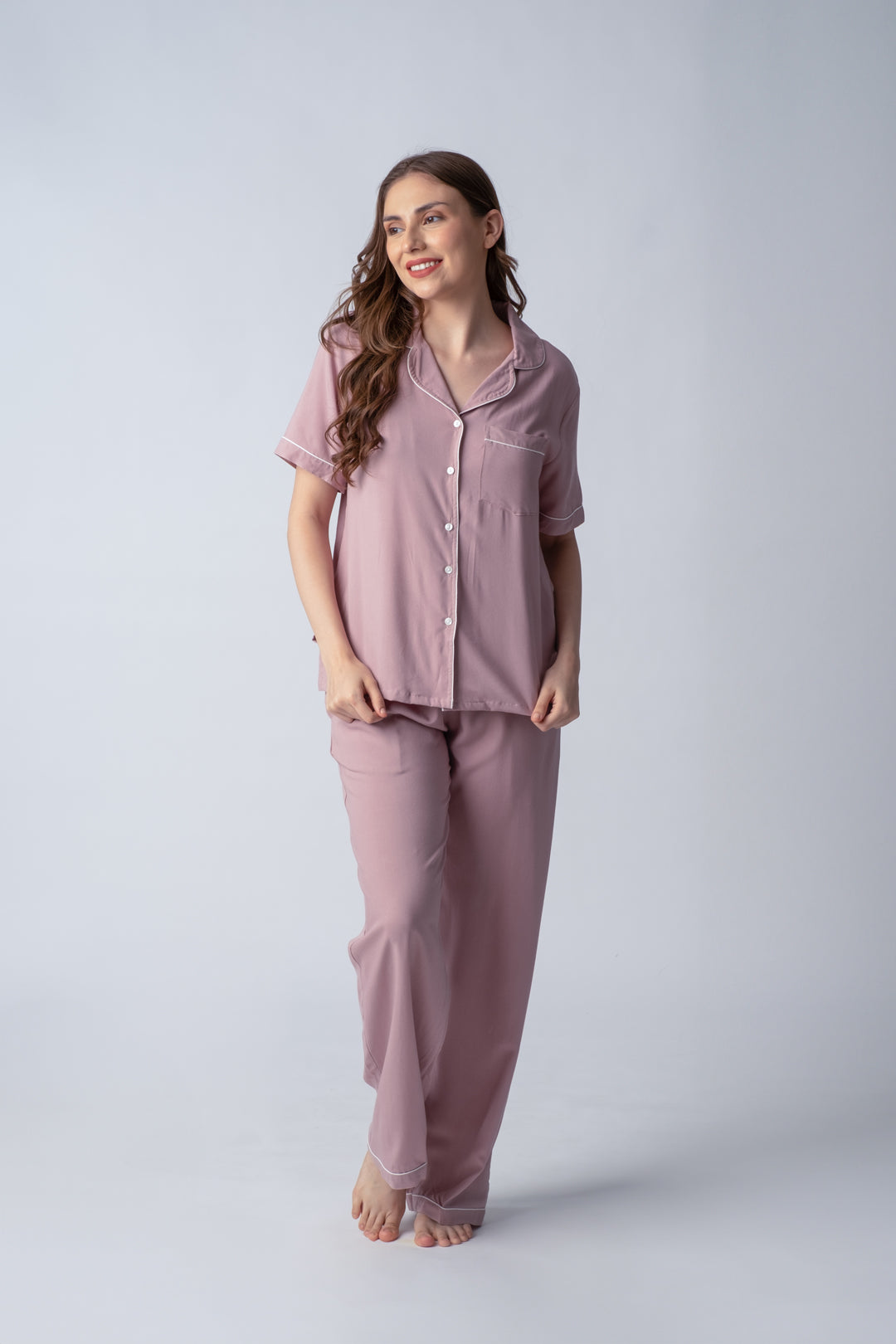 One of our classic styles, Mauve Emily Pajama set is perfect for your girls night in. Buttery soft hand feel, contrast piping on the pajama and shirt and white pearl-like buttons making it a 'must-have' piece in your wardrobe. Prepare to experience nights filled with blissful relaxation, enhanced by the beauty and elegance of our Classic Emily sets.