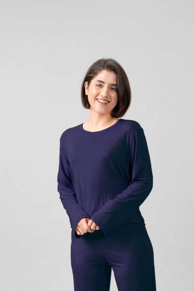 Designed in full sleeves for that extra touch of warmth, this piece is crafted from our signature cotton-modal fabric—soft, breathable, and made to feel like a second skin. Perfect for pairing with your favorite bottoms, lounging through lazy mornings, or layering on chilly nights, the Navy Top brings comfort and sophistication to every at-home moment.
