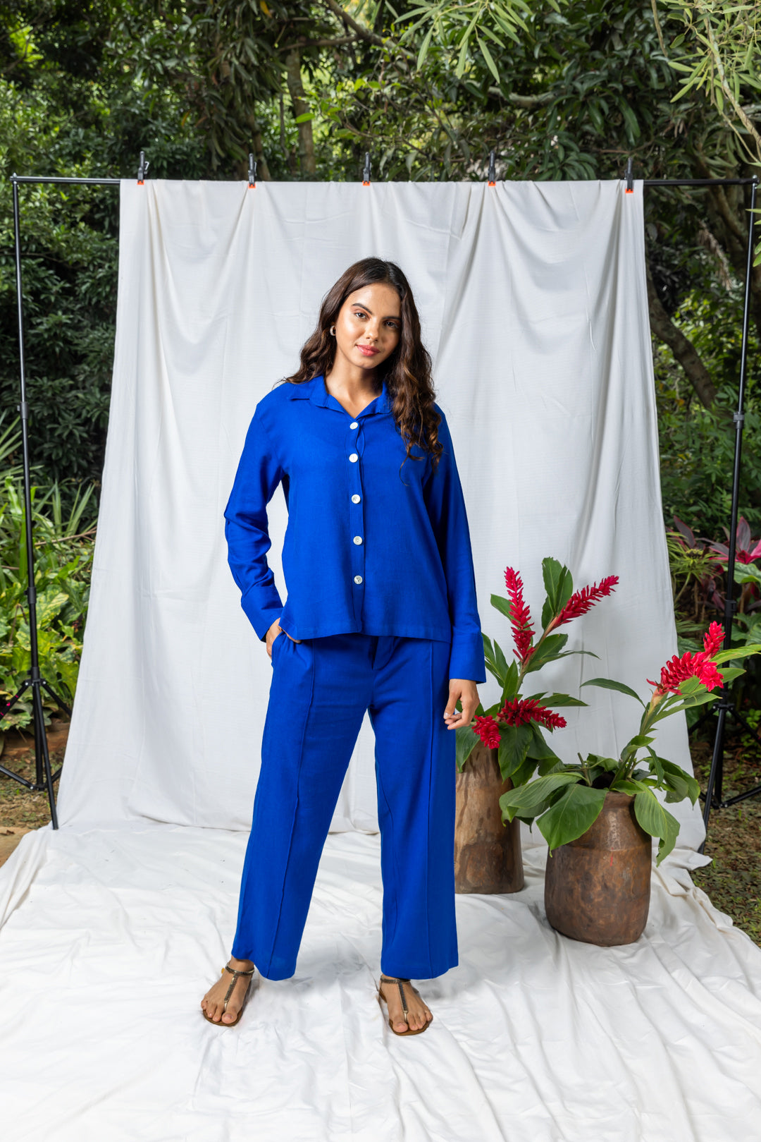 Introducing the Out of the Blue Shirt - a harmonious blend of style and comfort. It’s incredibly soft feel adds a touch of luxury to your look. With its classic shape, elongated cuffed full sleeves, and versatile length, it's a wardrobe staple that can be worn for various occasions. For a coordinated look, pair it with our Out of the Blue Pant, or let it shine as a statement piece on its own.