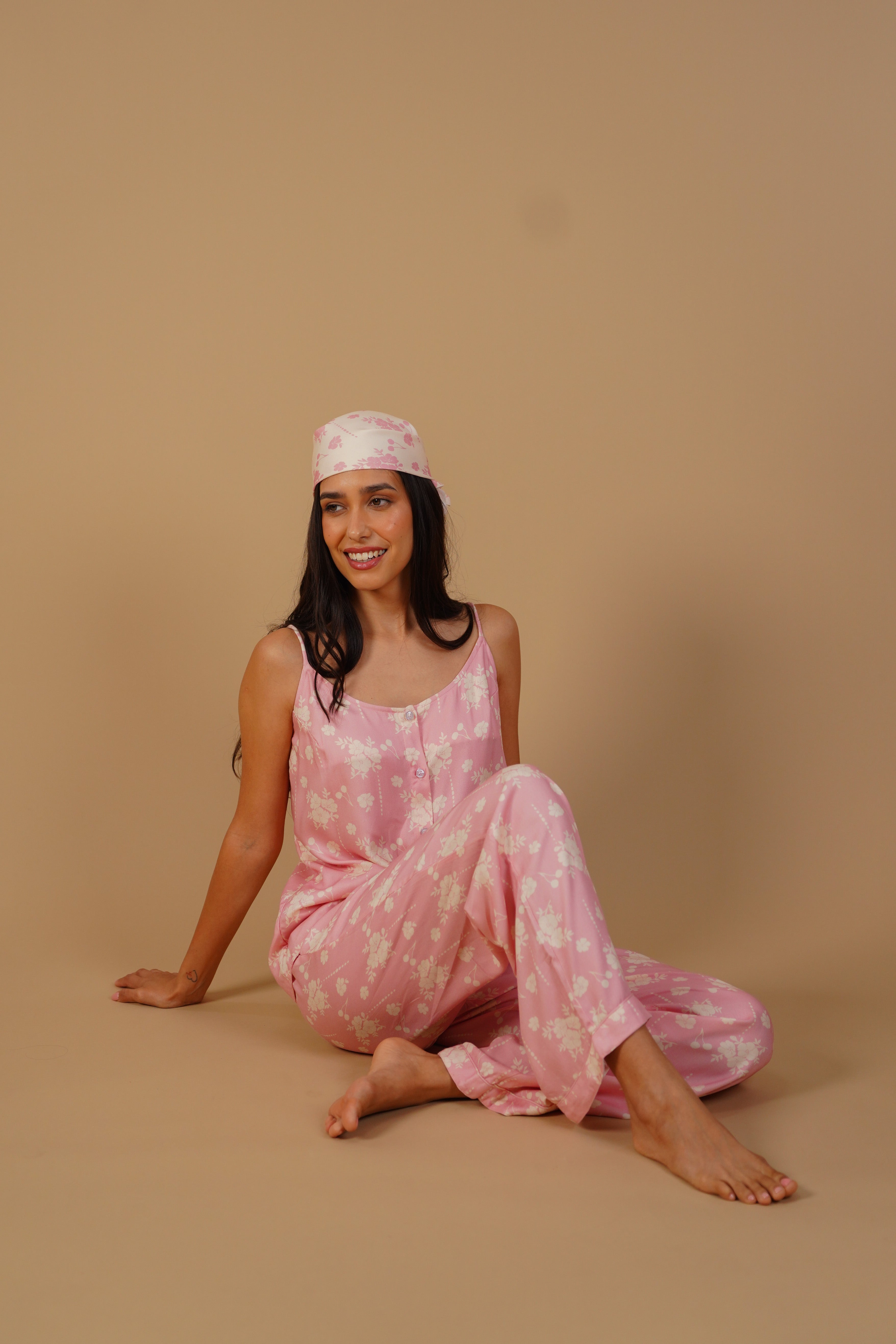 Pink Blossom Floral Printed Viscose Twill Women's Pajama Set - Sleeveless