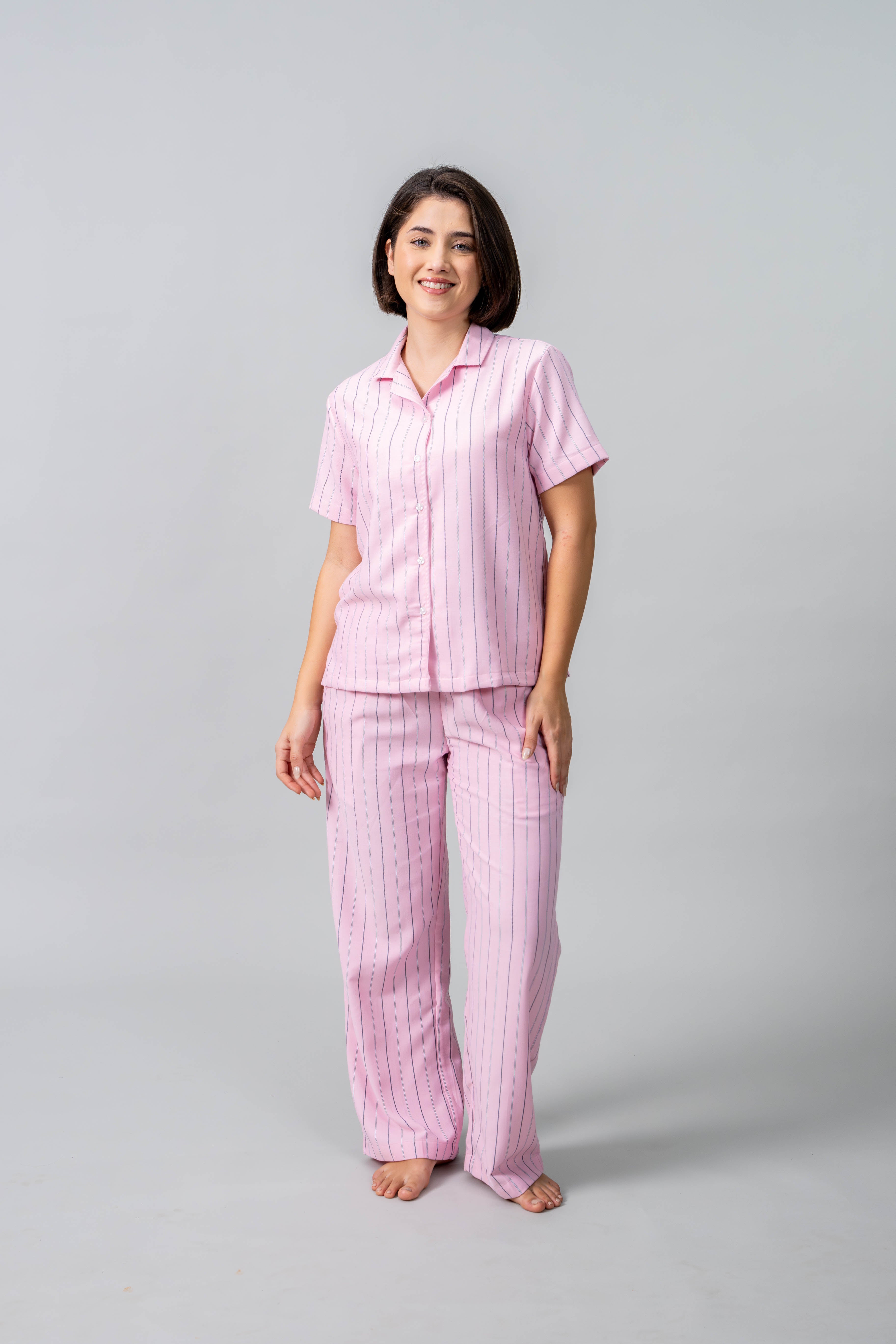 Pink Twill Stripe Cotton Women's Pajama Set- Half Sleeves
