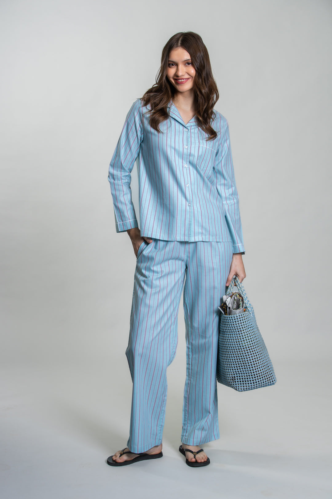 Tiffany Blue Twill Stripe Cotton Women's Pajama Set- Full Sleeves