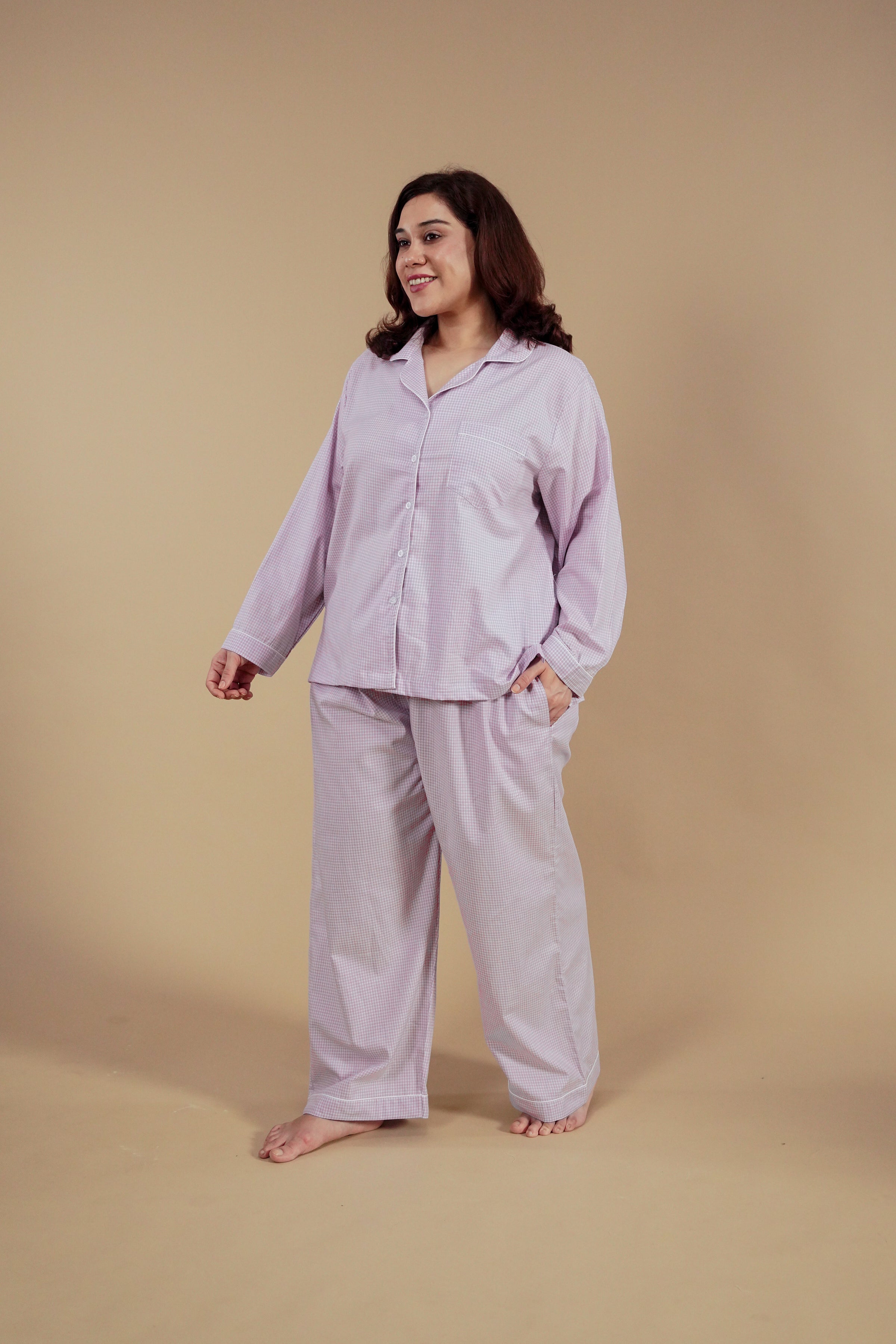 Ease into comfort with the Nora Pin Check Pajama Set, crafted from breathable cotton that feels soft and lightweight on the skin. Featuring a full-sleeve button-down shirt and relaxed-fit bottoms in classic pin checks, it balances timeless style with everyday comfort for all your lounge moments.