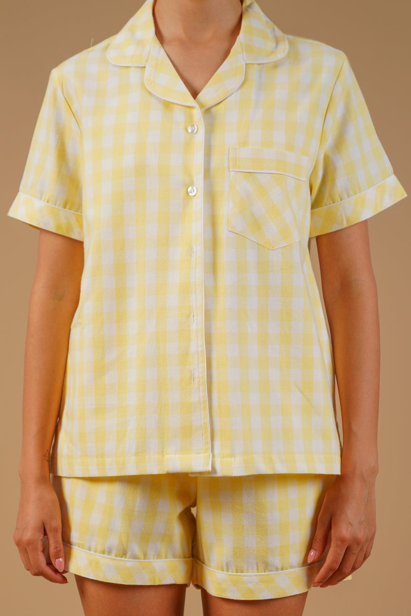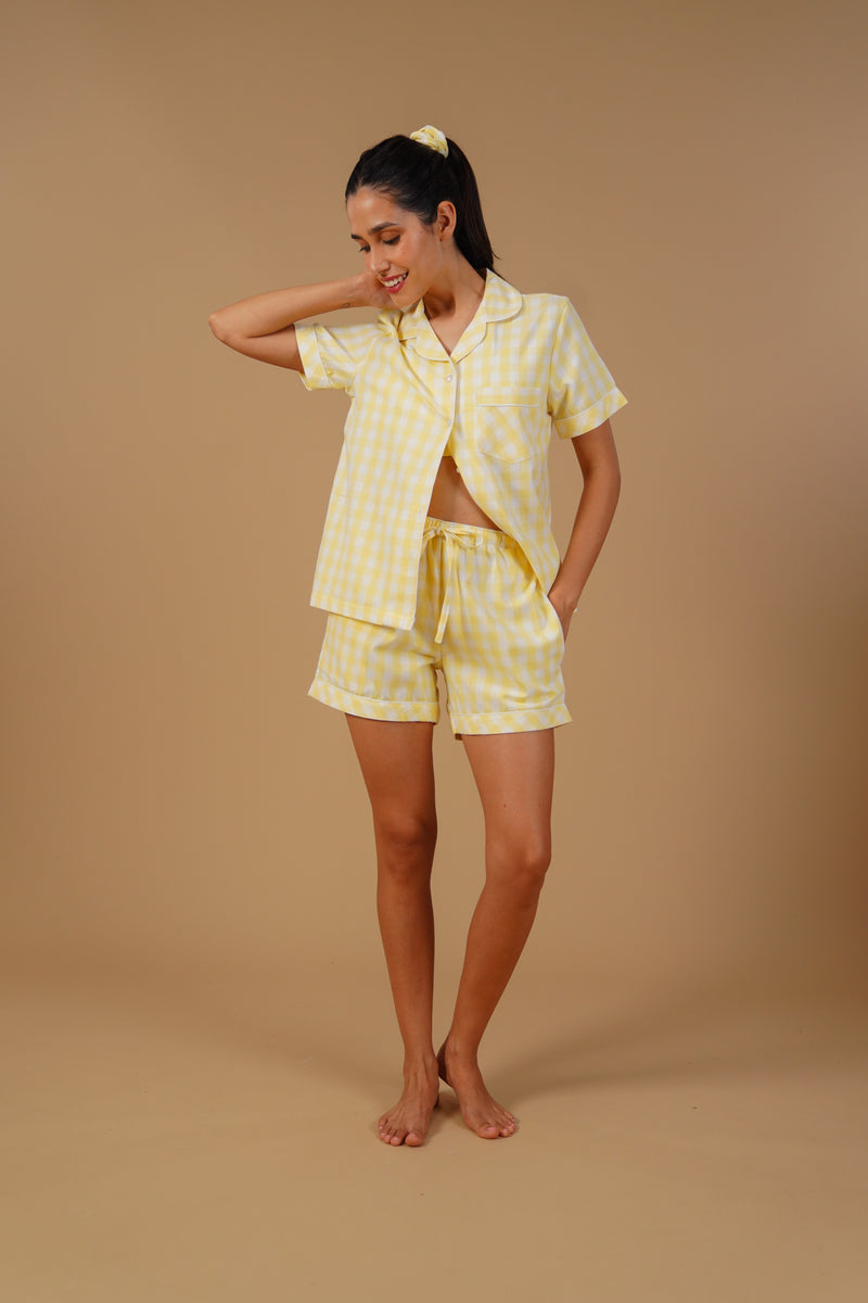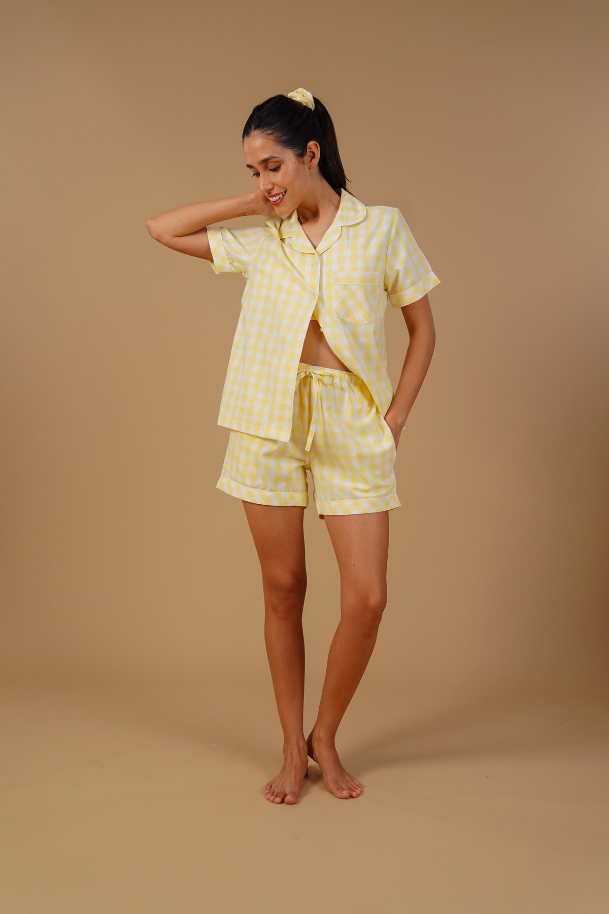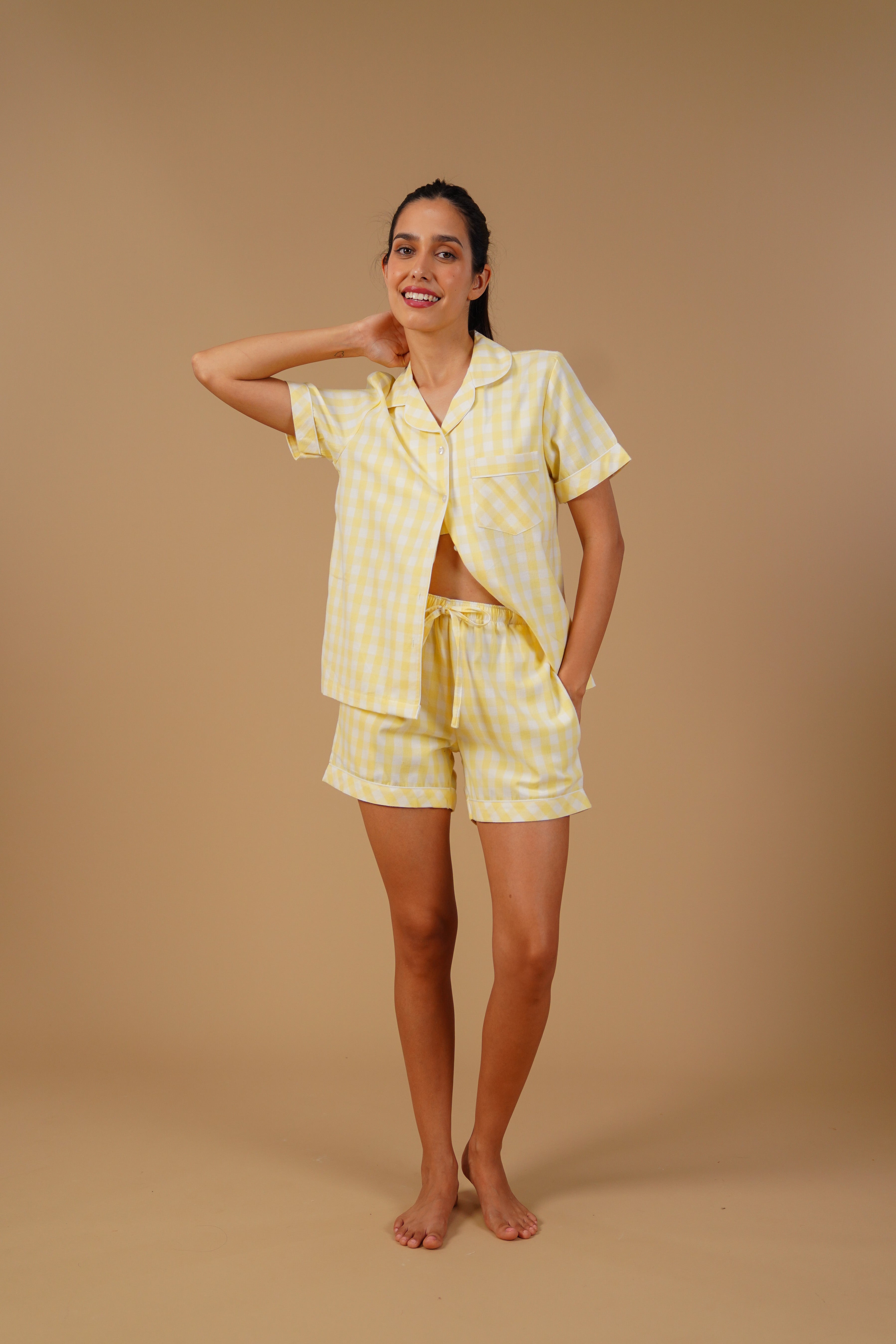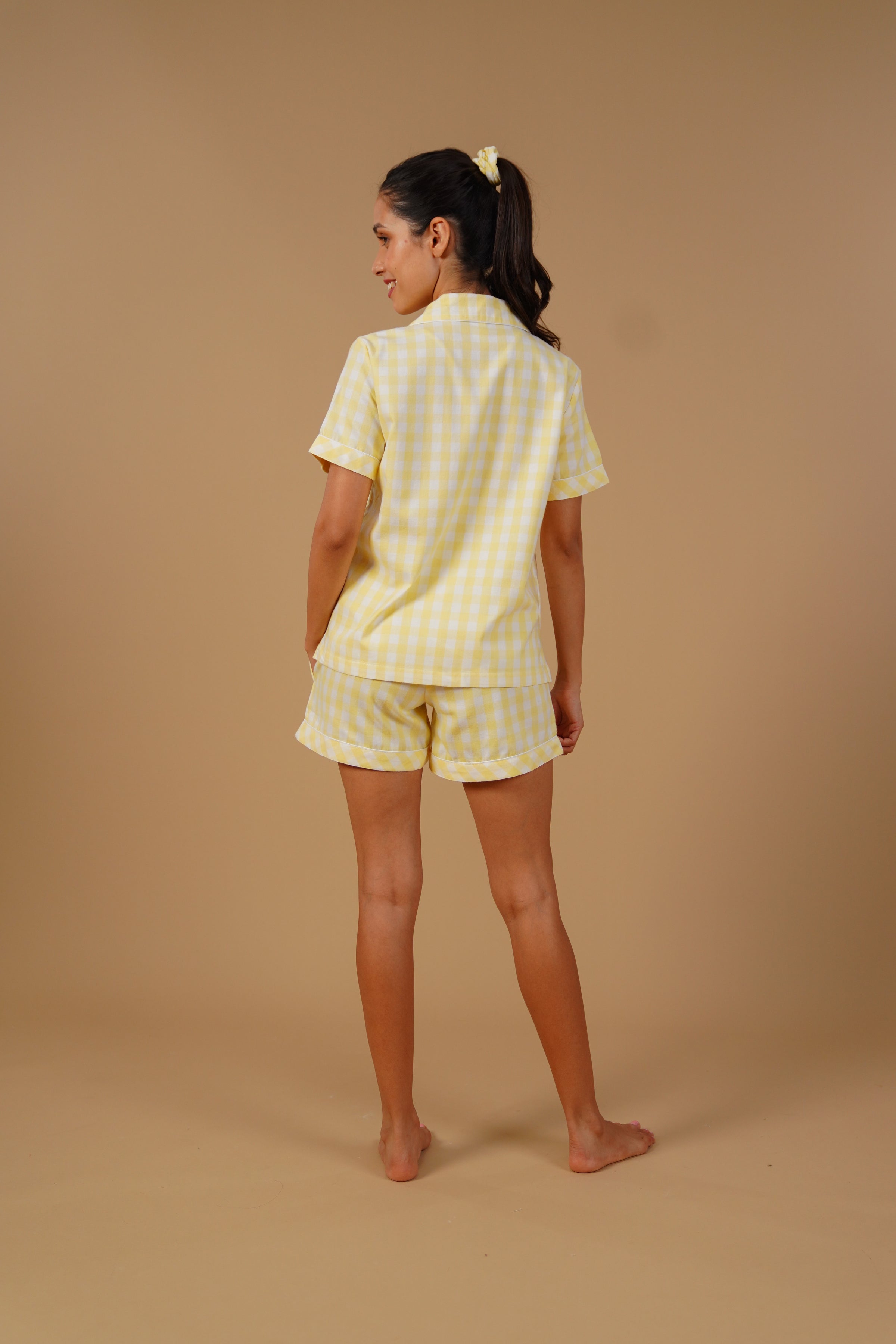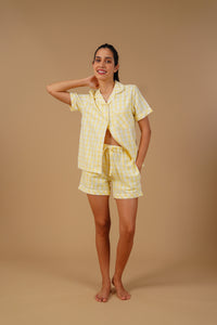 Butter Yellow Checks Cotton Twill Women's Shorts Set - Half Sleeves