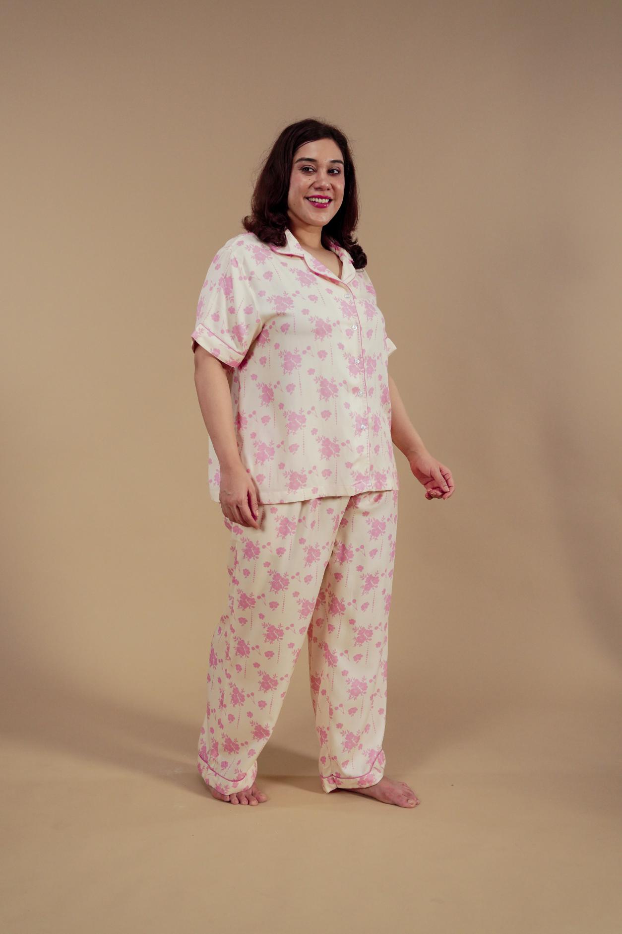 Beige Blossom Floral Printed Viscose Twill Women's Curve Pajama Set - Half Sleeves