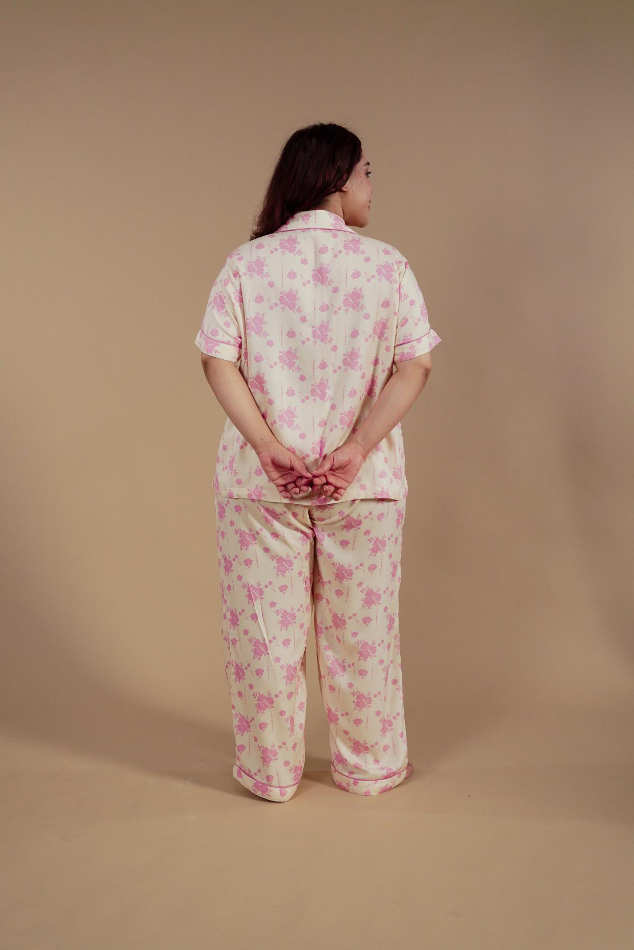 Featuring a half-sleeve button-down shirt and relaxed-fit pajama bottoms, this set brings a clean, polished look to everyday lounging. Whether it’s a quiet morning or an unhurried evening, the Beige Blossom Pajama Set makes winding down feel naturally stylish.