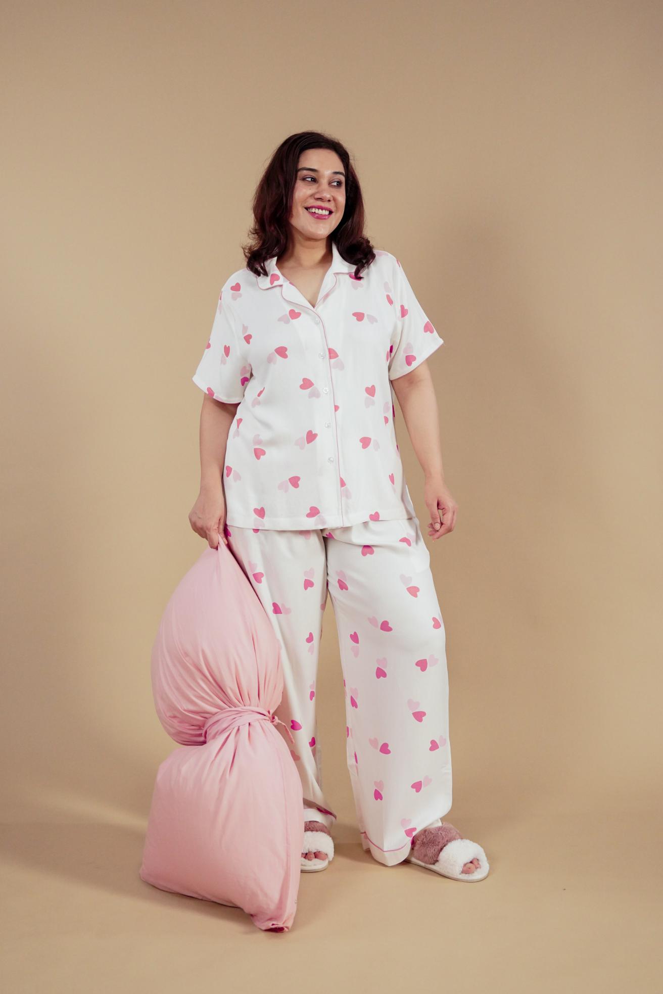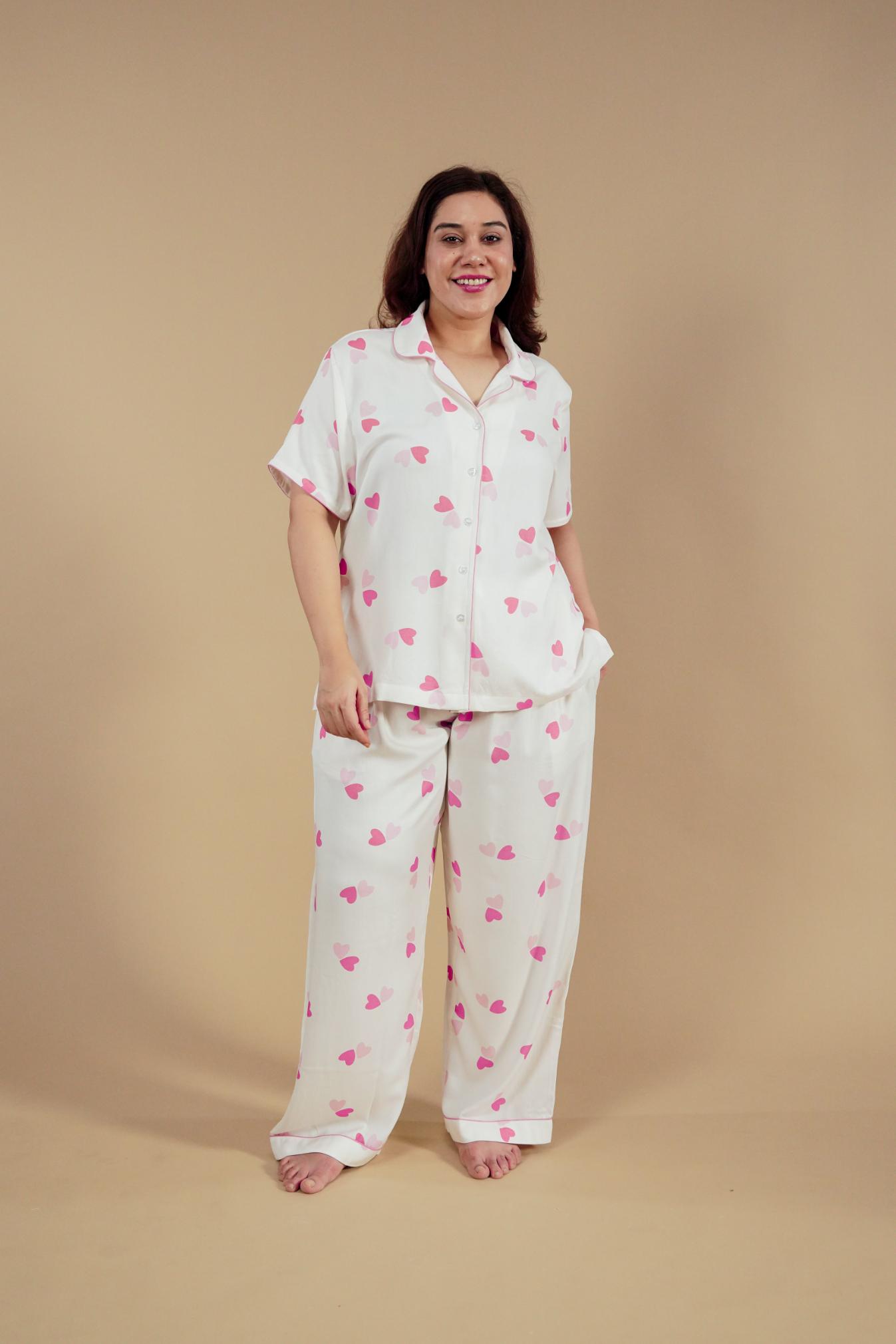 Amy Heart Printed Viscose Women's Curve Pajama Set - Half Sleeves