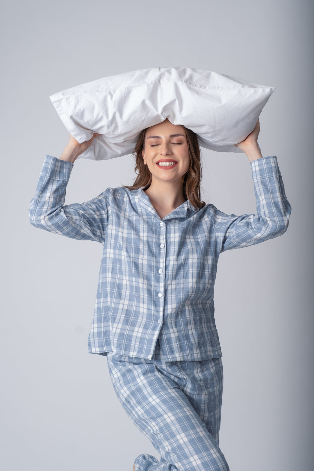 Indulge in comfort and style with these charming pajama set. Covered in classic blue and white check for that quintessential nightwear look, our sets add a touch of luxury to your bedtime routine. Made from lightweight and breathable cotton, they're perfect for staying warm on cooler nights.